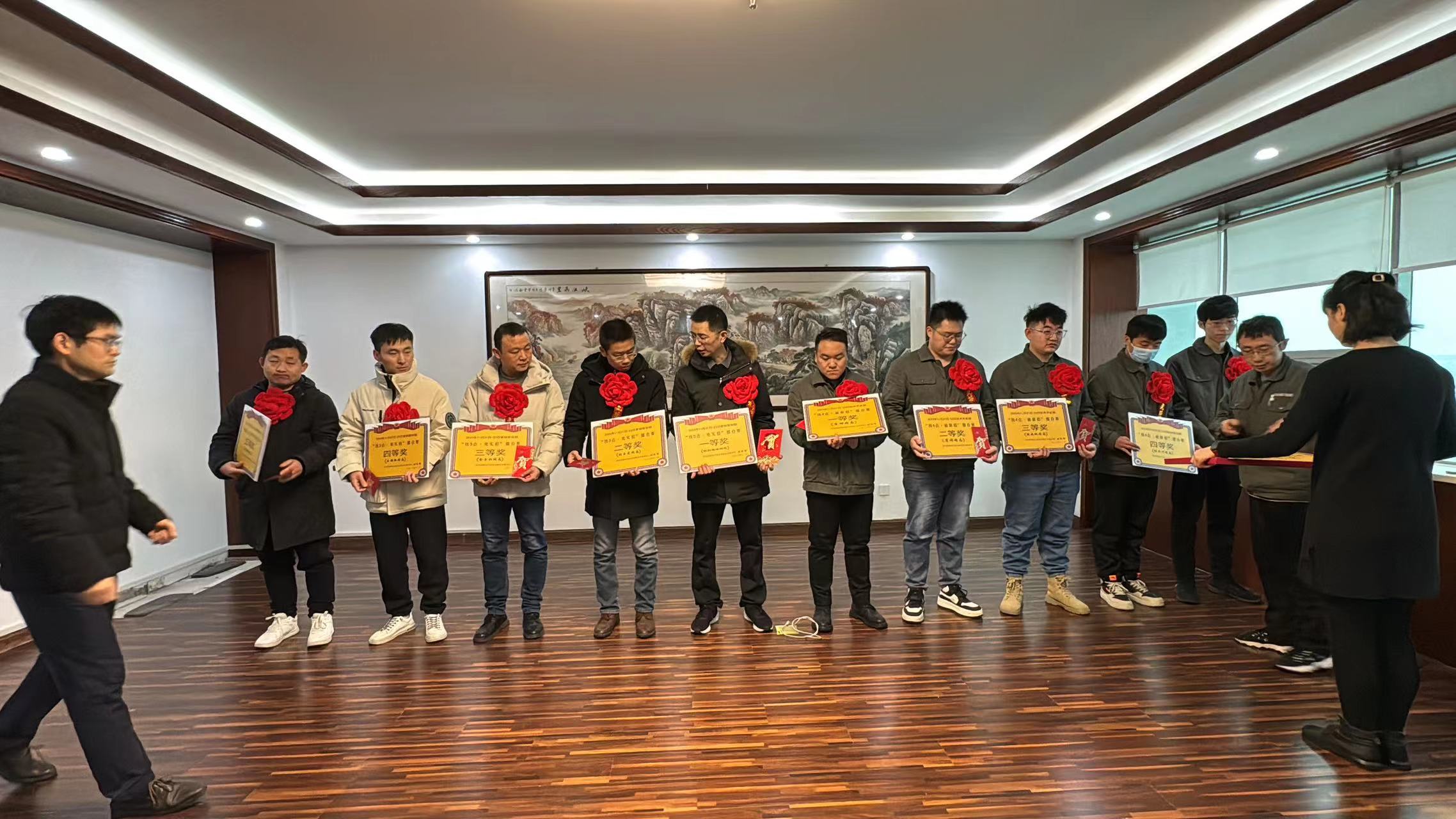 新入試營(yíng)銷(xiāo)員、技術(shù)員“獻(xiàn)新招、亮實(shí)招”競(jìng)賽頒獎(jiǎng)儀式圓滿(mǎn)結(jié)束,圖為董事長(zhǎng)劉運(yùn)智同志攜營(yíng)銷(xiāo)和技術(shù)主管與全體獲獎(jiǎng)?wù)吆嫌傲裟畹膱?chǎng)景。